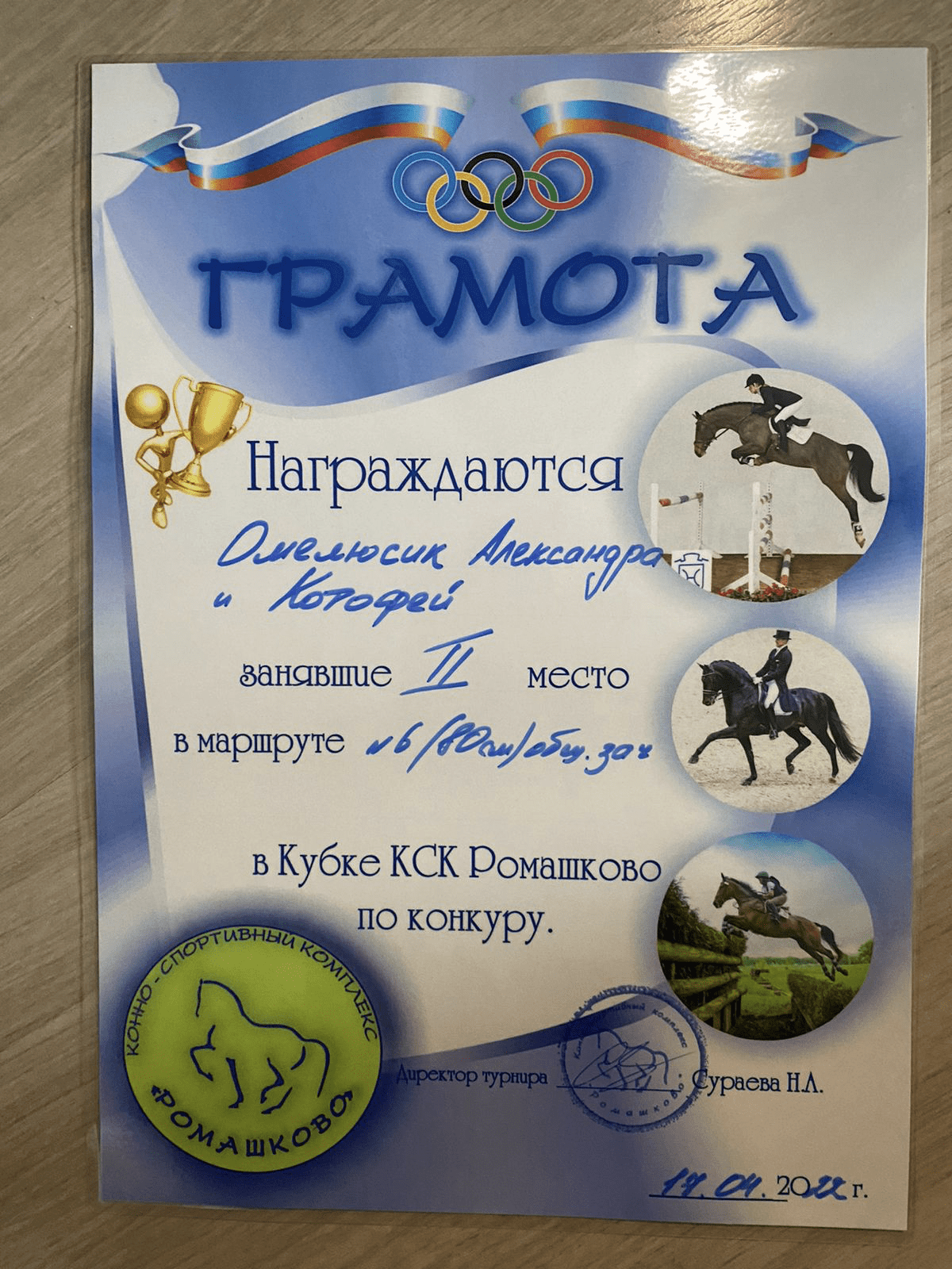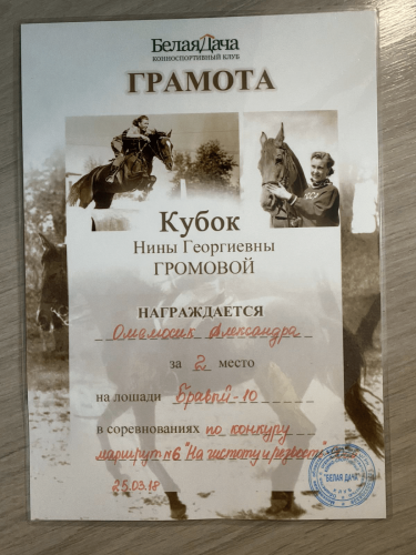 Молодой тренер, действующий спортсмен, выступает на соревнованиях по конкуру. Добрая, терпеливая, трудолюбивая. Имеет свою лошадь, которую воспитала сама. Найдет подход к ученикам. Всегда поможет и обучит верховой езде. На тренировках стремится добиться результата пары.